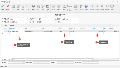 1)新增材料出库单,点击增加按钮进入新增模式,新增模式下必须输入产品编号,仓库,出库数量