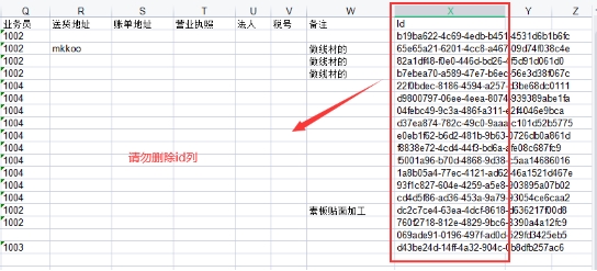2)编辑EXCEL模板:在打开的EXCEL模板中,编辑需要修改的栏位,红色列是必须输入的。修改模式下如果只需要修改某一列时,其他数据不用修改。其中最后一列的id列切不可删除