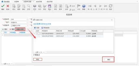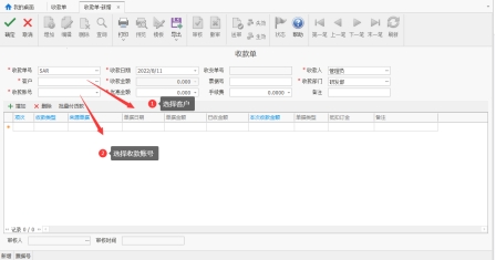 1)新增收款单,首先选择客户和收款账号,选择完毕后将自动带出其他信息,注意:收款账号必须和收款的销售订单,出货单币别一致