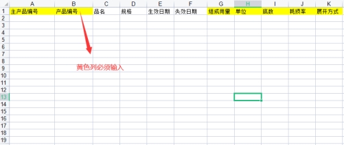 3)编辑EXCEL模板,根据上一步骤打开的EXCEL模板文件(如下图)进行资料填写。EXCEL中的黄色列必须输入,例如主产品编号,产品编号,组成用量等